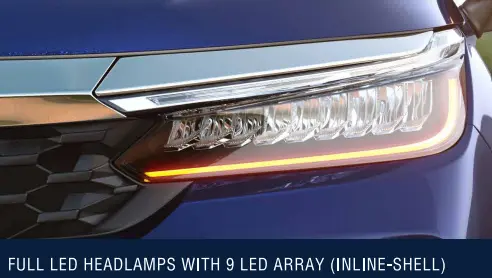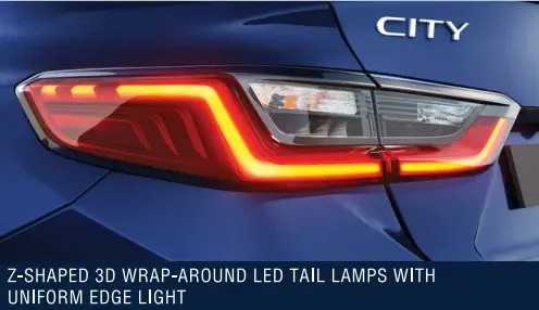 The All-New City is smartly styled with dignified stature and superior technological prowess. A wide, upper-grill in the front presents the signature Honda Solid Wing Face, and elevates the car to a position of prominence. This bold front is taken to the next level with the integration of Full LED Headlamps(with 9 LED array inline shell, integrated LED DRL, L-Shaped LED Turn Indicator), a first in the segment. In the rear of the All-New City, Z-shaped 3D Wrap Around LED Tail Lamps with Uniform Edge Light & LED Side Marker Lights continue to highlight the sleek design of the car.